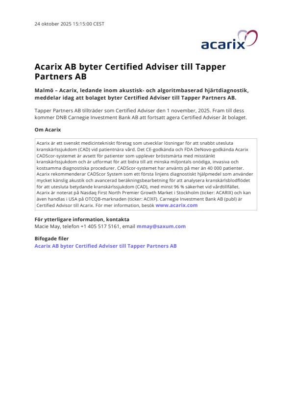 Malmö – Acarix, ledande inom akustisk- och algoritmbaserad hjärtdiagnostik, meddelar idag att bolaget byter Certified Adviser till Tapper Partners AB.