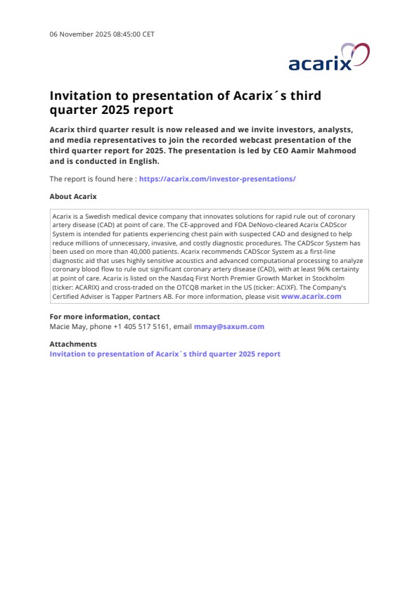 Acarix third quarter result is now released and we invite investors, analysts, and media representatives to join the recorded webcast presentation of the third quarter report for 2025. The presentation is led by CEO Aamir Mahmood and is conducted in English.