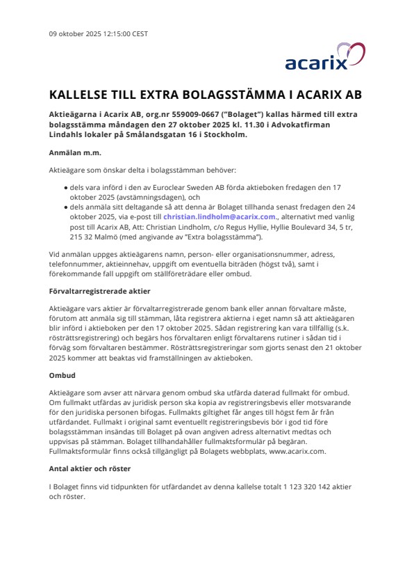 - dels anmäla sitt deltagande så att denna är Bolaget tillhanda senast fredagen den 24 oktober 2025, via e-post till christian.lindholm@acarix.com., alternativt med vanlig post till Acarix AB, Att: Christian Lindholm, c/o Regus Hyllie, Hyllie Boulevard 34, 5 tr, 215 32 Malmö (med angivande av ”Extra bolagsstämma”).