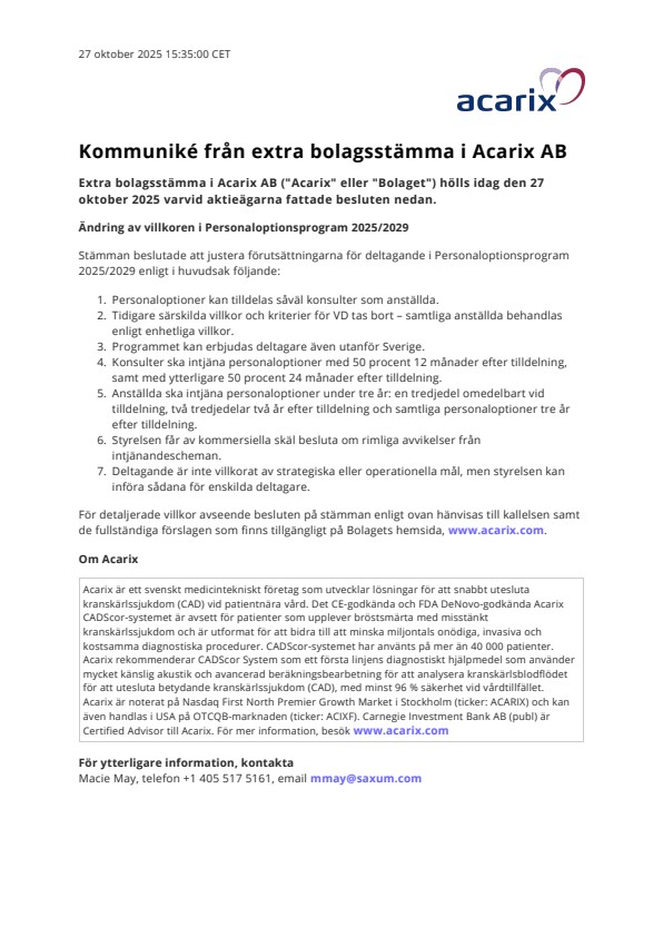 Extra bolagsstämma i Acarix AB (“Acarix” eller “Bolaget”) hölls idag den 27 oktober 2025 varvid aktieägarna fattade besluten nedan.